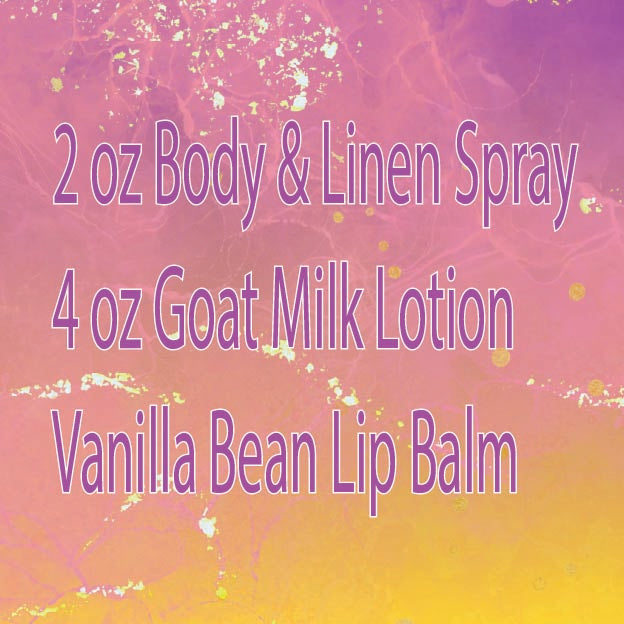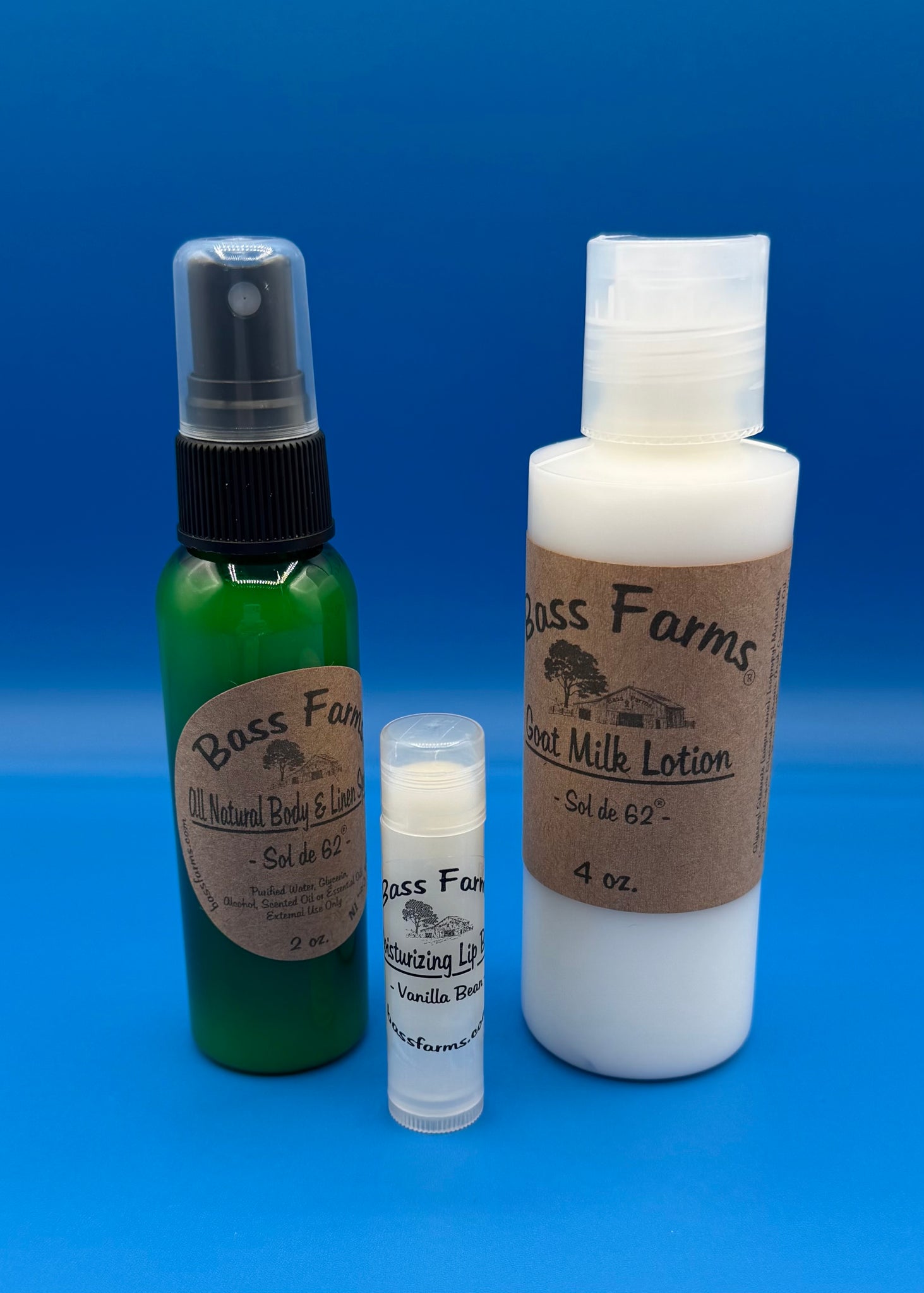 Give the glow of the season with our Sol de Gift Set! This Limited-Edition Bundle includes a 2 oz Body/Linen Spray, 4 oz Goat Milk Lotion, and a full-size Vanilla Bean Lip Balm; Everything you need for sunshine-soft skin and your signature #'d aroma ☀️ Available now through January 31!